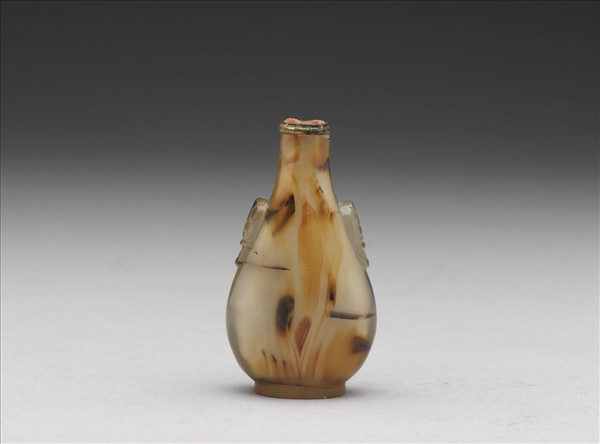 瑪瑙瓶式鼻煙壺,圓口,長頸,梨形扁腹,矮圈足;色澤灰白半透明沁灰褐黑斑,肩浮雕獸首銜環。帶銅蓋(缺嵌飾)與牙匙。