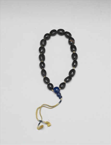 由十八粒松子及一粒青金石佛頭塔以米白色編繩串成,編繩兩端及會合處以藍白絲線纏繞固定。附金漆蒔繪黑漆方盒及藍地白花雷紋花卉織錦各一。附一乾隆九年(1744)的滿文黃籤,籤上說明手串為皇貴妃祖母獻給皇祖康熙的禮物。