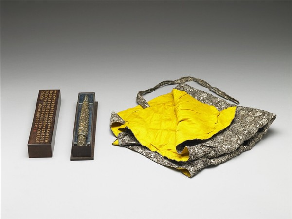 鐵質刀,刃部尖端圓弧收尖,刀柄及刀鞘由獸角製成,再用鏤空卷葉紋銀套裝飾,刀鞘近開口處有一圓環。書刀是用來刻竹簡或將錯字削去的工具,附長形木盒及錦袱一。