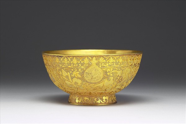金碗貯放於木胎描金圓皮盒中,盒蓋內白綾上書寫漢、滿、蒙、藏四種文字記載金碗的來歷:「乾隆四十九年十二月十七日(1785)哈密札薩克郡王品級貝勒額爾德希爾呈進金碗一件。」據考證,札薩克郡王六世額爾德希爾為答謝乾隆皇帝下詔其家族世襲爵位,因此進呈此金碗。這件來自新疆的金碗,以掐絲技法在口沿與圈足裝飾花葉紋,碗腹鏨刻石榴並掐絲花葉紋,再利用極具特色的黃金焊細珠工藝,將極細小金珠裝飾鋪地,使碗壁佈滿金珠,雖如同鏨刻魚子紋,卻呈現出特別的質感與異域風格,圈足內陰刻雙鉤「乾隆御用」楷款。是為乾隆皇帝御用器。附皮盒。