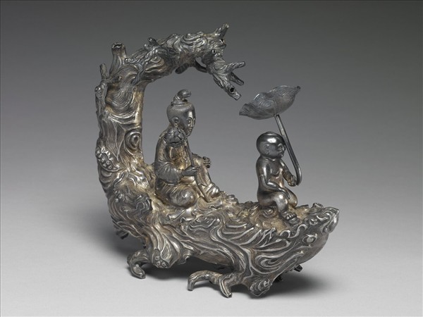 銀雕以蘭木樹幹為槎,強調樹幹的紋理與姿態,槎中有半跏坐持蓮觀音,前坐持蓮葉童子,背面有「乾隆丙戌秋月內府仿元銀工朱碧山製」款,為乾隆三十一年(1756)內府仿造,所模仿的「朱碧山」銀槎現存於北京故宮,將常見的張騫乘槎造型加以變化,顯示刻塑銀器在清代的延續與發展。