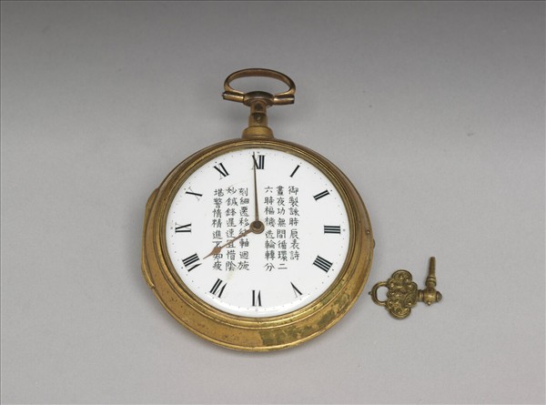 圓形錶,表面銅鍍金,蓋面原或嵌玻璃,銅質二針,錶盤琺瑯釉白底黑字,中央墨書楷體嘉慶皇帝「御製詠時辰表詩」,文字稚拙。錶背有一孔供上弦,附銅匙。錶貯入銅鍍金錶盒,外貼一黃籤,楷書:「養心殿」。
