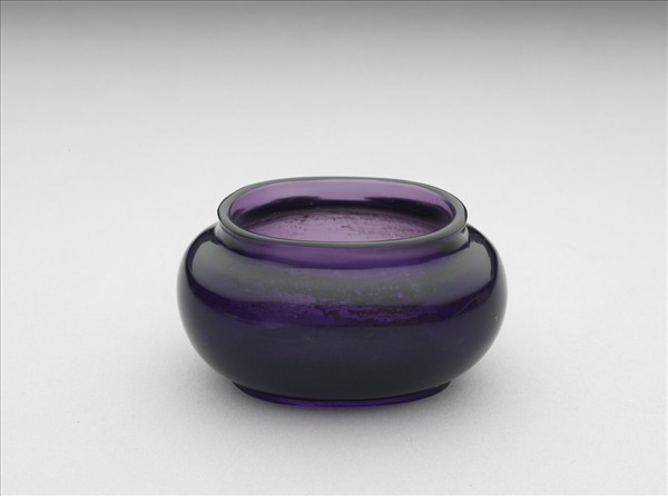 橢圓形紫色玻璃水盛,短頸鼓腹矮圈足。通體發色濃沉,映光清潤,器底有「乾隆年製」楷書方框刻款。據《活計檔》記載,乾隆三年(1738)玻璃廠曾奉旨燒製五色玻璃水盛與筆架。乾隆四十一年(1776)曾有將「頂圓紫玻璃荷葉水盛」收入百什件匣盒的記錄,紫玻璃文房具當屬宮廷珍賞品類之一。