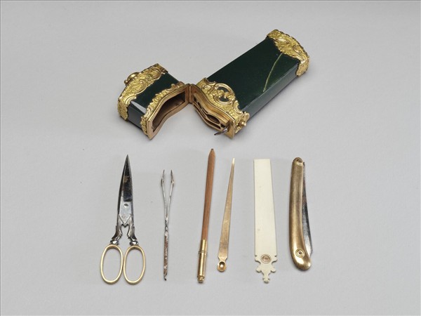 扁長方匣式,器外壁鑲嵌碧綠色石,內貯:小刮鬍刀、小剪刀、眉毛夾、鉛筆、象牙記事片。