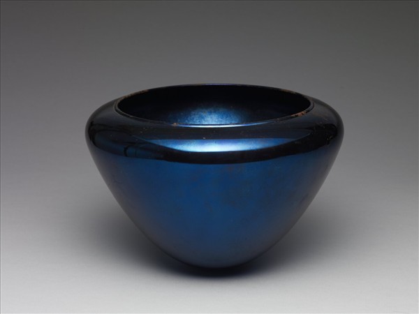 斂口鉢,深壁急收,底銳而圓,壁極薄,甚輕,通體靛藍色,有銹傷。外底刻雙鉤:「大清乾隆年製」空心楷字。院藏此種鐵器鍍藍的技法,僅見於此種鉢形器皿,似乎意起於仿青金石鉢之顏色與外形。附描漆皮盒。