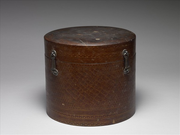 掀蓋式圓筒狀皮盒,開口處以金屬鉤環扣合。盒蓋及盒體下緣繪幾何紋條狀裝飾,盒體滿繪龜甲紋錦地,有四海棠形開光,內古錢紋錦地,錦地內間飾小花,並罩褐色透明漆料;內襯紅色花綾裡,蓋內側有墨書漢、滿、蒙、藏四體字:「利益鐵鉢一件」。