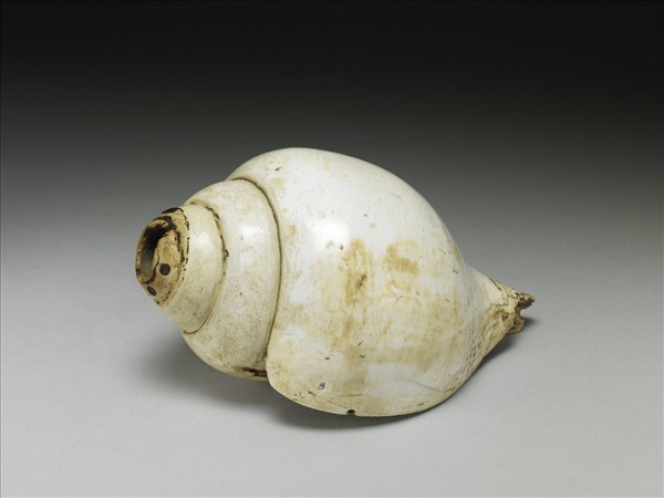 左旋白色聖貝,頂端鑿吹孔。在西藏,螺可做為吹奏的樂器、法號,在佛壇上也常是盛放甘露的容器。螺類左右旋方向在中國傳統觀念中的定義與現代貝類學不同,故兩者之認定正好相反。