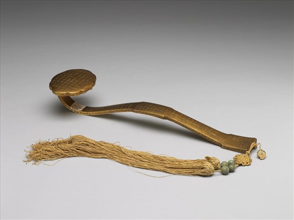 銅鍍金如意,雲葉式首、柄中央隆起,腹與趾均作長方,繫雙穗。全器除邊側飾回紋外,首與柄之表面與底面,均滿刻漢字隸書之金剛經經文。有「依法出生分第八」、「一相無相分第九」二段,穗上亦繫桃形小香絆,書「寅」字。