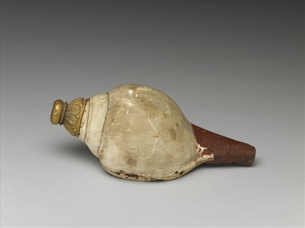 白色螺,形制左旋。頂心一通孔為吹孔,以便吹奏,鑲鍍金裝飾,飾蓮瓣紋及連珠紋,另一端鑲朱漆頂。在西藏,螺可做為吹奏的樂器、法號,在佛壇上也常是盛放甘露的容器。螺類左右旋方向在中國傳統觀念中的定義與現代貝類學不同,故兩者之認定正好相反。