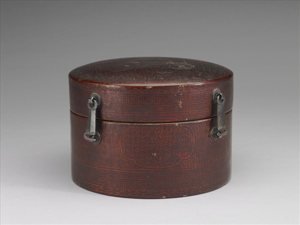 掀蓋式圓筒狀皮盒,開口處以金屬鉤環扣合。盒蓋及盒體下緣繪幾何紋條狀裝飾,盒體滿繪龜甲紋錦地,有四海棠形開光,內繪古錢紋錦地及花葉紋,並罩褐紅色透明漆料。
