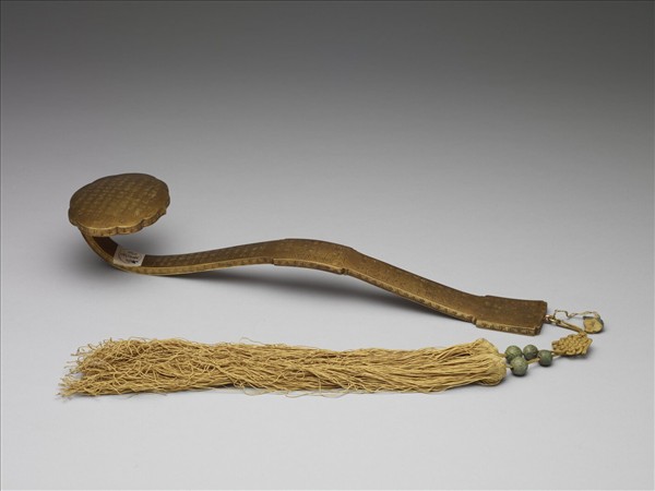 銅鍍金如意,雲葉式首、柄中央隆起,腹與趾均作長方,繫雙穗。全器除邊側飾回紋外,首與柄之表面與底面,均滿刻漢字隸書之金剛經經文。有「一合理相分第三十 」、「知見不生分第三十一 」、「應化非真分第三十二」三段,穗上亦繫桃形小香絆,書「辰」字。