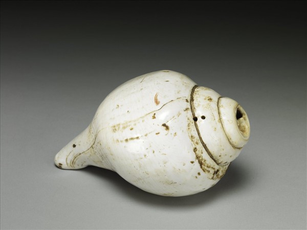 左旋白色聖貝,頂端鑿吹孔。在西藏,螺可做為吹奏的樂器、法號,在佛壇上也常是盛放甘露的容器。螺類左右旋方向在中國傳統觀念中的定義與現代貝類學不同,故兩者之認定正好相反。