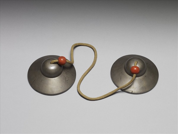 小鐃鈸一枚,與另一枚鈸(故雜1333)以黃繩相連接,並串有二紅色珠子,是西藏樂器之一。其邊緣立起,常產生悽厲刺耳的高音,隨著鐃鈸的振動而細音嫋繞。西藏樂器有雄渾的大鼓、碎快的手鼓、響亮的鐃鈸、深沉的海螺、清越的鈴聲、銳嘯的竹笛、悠遠的長號、尖細的脛骨號等,各樣單音的諸聲並作,形成獨特粗獷原始的音樂,在密宗修法與儀式中是凝聚意念的重要因子。
