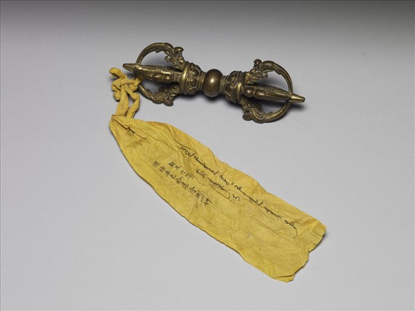 金剛杵,兩端首尖銳,作五股式,摩羯首銜之,托飾兩道弦紋及一圈蓮瓣紋,下接一圈連珠紋。手執處光素無紋。密宗佛教中,金剛杵象徵摧滅煩惱的菩提心,為諸尊之持物或修法的道具,能破除魔障。五股杵代表五智五佛。附黃籤,上墨書漢文:「進拴五色哈達金剛一件,拉木吹準」及滿文同義字。