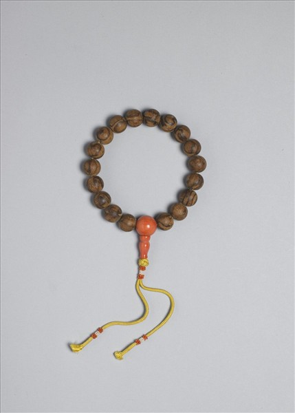 茄楠木手串,據黃籤記載至少是乾隆年間已入宮收藏,以珊瑚珠為佛頭、佛頭塔,或有加串飾。所附錫盒皆包有錦布,也有嵌玻璃蓋,內部有各個鏤空錫隔墊。盒內還有香末,足見清宮以茄楠香末養香的樣貌。至今打開錫盒香味依然。
