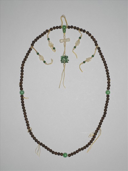 茄楠木念珠,共一百零八顆,以翠玉為佛頭。佛頭塔下綴有白玉杵、翠玉囍字墜;兩側有四串飾,各串以米珠、翠玉珠及白玉墜裝飾,分別是吉祥結、寶瓶、雙魚及蓮花。
