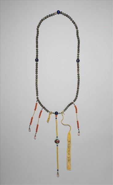 呂松果朝珠,呂松果一百零八顆,每二十七顆插入一顆青金石佛頭。頂端有青金石佛頭、珊瑚佛頭塔,下垂黃縧,綴有碧璽背雲、黃金寶蓋嵌碧璽墜角;兩側有記捻共三串,各串貫珊瑚珠十顆,黃金寶蓋嵌碧璽小墜角。附有黃籤二張:一張一面書:「世宗憲皇帝供奉」,一面書:「呂松果朝珠一盤」,另一張書「世宗」。朝珠源自數珠,是清朝君臣命婦穿著朝服或吉服時垂掛於胸前的飾物,由一百零八粒珠貫穿成,每二十七粒插入一粒他種質材的珠作佛頭,並有記捻三串,每串有珠十粒,在記捻間的佛頭上有一佛頭塔,下垂一背雲。懸掛時,背雲垂於項後,記捻一邊兩串,一邊一串垂於胸前,兩串者男在左,女在右。清制,上自皇帝,下及文職五品與武職四品以上官員或命婦,與京堂、翰、詹、科道、侍衛、禮部、國子監、太常寺、光祿寺、鴻臚寺部分所屬官員,可垂掛朝珠。其中,皇太后、皇后及命婦穿朝服時需掛三串朝珠,餘皆掛一串朝珠。