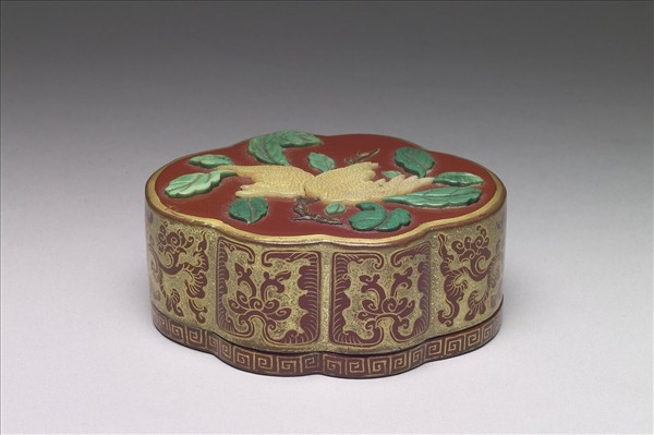 四方瓣式盒,盒內及盒底髹紅褐色漆,盒內底繪描金如意,盒側描金花卉,沿邊飾回紋,簡化而規矩,盒蓋褐漆地上嵌黃綠色玉石佛手,色彩鮮艷。
