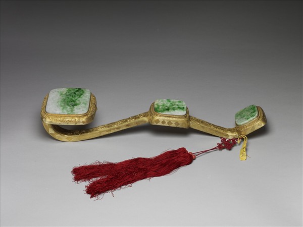 三鑲如意,方首,柄中央及趾隆起成方形,鑲光素方形翠玉,框邊鏨刻卷葉紋;柄面鏨刻人物,側邊鏨刻回紋;背面飾纏枝花卉紋。趾繫紅雙穗、盤長結。