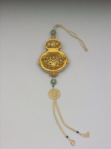 全器呈葫蘆形。葫蘆的上半部實際上為蓋子,呈如意雲頭形。拆開後可將香品裝入囊中。囊腹呈香荷包狀。上下有珠子及結飾。香囊外側有貫耳,可以穿繩而過,囊頂的珠子起繫緊繩子的作用。此香囊配有鏤空的木架,以楠木雕刻成葫蘆蔓藤的式樣。