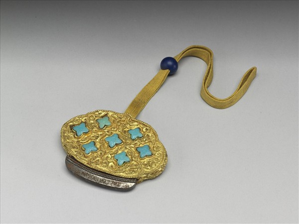 雲頭形火鐮盒,穿繫明黃縧帶與青金石豆,末端嵌打火用金屬片,四面鏨刻流雲紋,鑲碧藍色四瓣不透明玻璃花飾。盒緣鏨刻縧索紋。玻璃表面光潤,色澤近似綠松石。