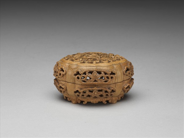 此器通體竹雕,作海棠花形盒。周壁及器面透雕番蓮紋及枝葉紋,四足作如意雲形。
