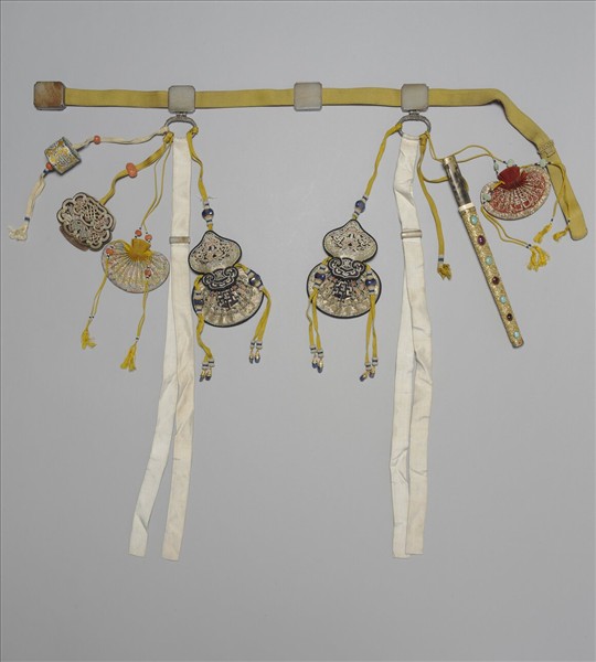 明黃色腰帶,內襯紅色織錦。帶上裝有四方形嵌玉帶頭及三件玉帶板。兩側帶板下的環狀帶銙繫有直長形白色佩帉各一,佩帉上有長方形白色玉結,黑色盤金繡葫蘆形荷包各一;左側尚繫有黃色盤金繡荷包、黑色盤金繡盤長萬福火鐮盒、黃地團壽紋圓盒;右側則有紅地盤金繡囍字荷包及牛角柄金鑲紅寶、松石刀鞘小刀一把。將腰帶、組繩的色彩及配飾形制與清乾隆年間成書的《皇朝禮器圖式》相對照,本件可能是皇帝或皇太子穿著吉服時所使用的吉服帶。