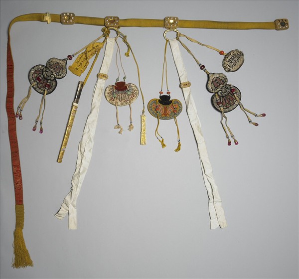 明黃色腰帶,內襯紅色織錦。帶上裝有四方形金嵌珠帶頭、三件金嵌珠帶板及金質帶扣一只。兩個帶板下的環狀帶銙繫有直長形白色佩帉各一,佩帉上有金質長方形結,鑲有珍珠與寶石;另繫有黑底彩繡囍字福壽紋葫蘆形荷包各一;左側尚繫有紅色盤金繡荷包、金質長形小盒一與牛角柄金鑲紅寶、松石刀鞘小刀一把;右側則有黃地繡囍字荷包及黑色盤金繡囍字龍紋火鐮盒。有黃籤:「光緒三十二年十一月二十六日(1907)/聖母皇太后更換正珠六顆/崔玉貴傳」將腰帶、組繩的色彩及配飾形制與清乾隆年間成書的《皇朝禮器圖式》相對照,本件可能是皇帝或皇太子穿著吉服時所使用的吉服帶。