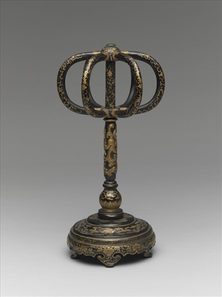 帽架,放置故雜1494的「清高宗夏朝冠」。木胎髹黑漆,置帽架以六環狀柄組成,中央為支架,下接圓形如意雲足座。帽架以金漆繪番蓮花葉紋,支架中央浮雕螭龍,上塗金漆;底座則繪有雲蝠紋、蕉葉紋、靈芝紋,番蓮紋等吉祥紋飾。底部貼有黃籤。