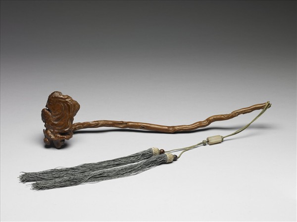 天然木根或樹枝略經整治,而成長柄靈芝形如意。首似大本靈芝,附生小芝兩本;柄略彎曲,背面陰刻楷書填綠「九莖三秀」、填青「山川雲雨。五行四候。化被神芝。以介眉壽。東村」。刻鈐「東村」、「大英」。趾端繫湖綠雙穗、玉勒一、玉珠二。