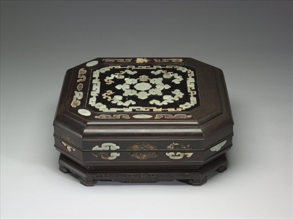 清代特製木盒,盒蓋嵌幾何連續紋玉片,盒身寬廣和小櫃高深的形式不同,打開盒蓋大部份的物件都可以一眼得見,是清宮存放珍玩的一種類型。此盒收貯清代玉器29 件、瓷器1件、琺瑯1件、小畫卷2件、如意1件,含外盒共35件。