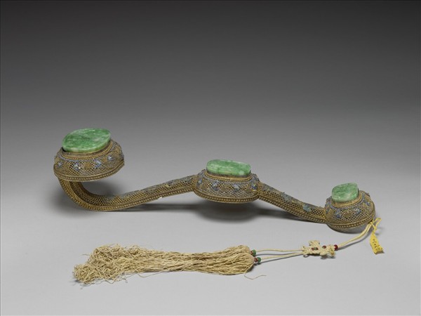 三鑲如意,通體皆以鍍金纍絲透空古錢紋鑲接而成;心形首,腹與趾橢圓形,各鑲翠玉一塊,皆浮雕象背馱瓶紋飾,意寓「太平有象」,鑲座四周及柄兩側飾金珠團壽、長壽和藍、紫、綠色琺瑯釉蝴蝶相間;柄中央隆起,柄面鑲琺瑯暗八仙,象徵「八仙祝壽」之意。背面光素無飾,趾端繫淺黃色編花雙穗。