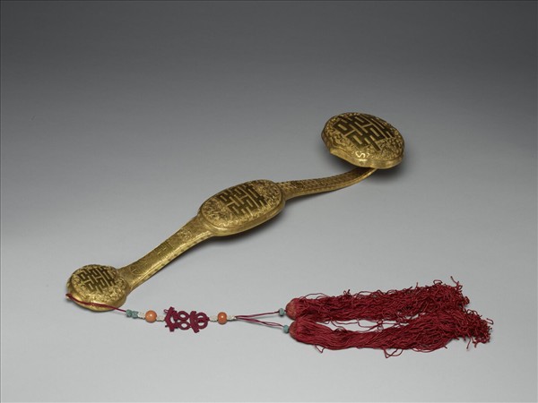三鑲如意;雲葉式首與趾,橢圓形腹,首面與趾面各飾一組雙蝠捧囍紋,腹面飾一組雙蝶捧囍紋;柄面鑄卍字不斷紋為錦,飾團壽二、蝙蝠二、雙囍一;首、腹、趾周圍及柄兩側飾回紋。背面光素,腹背陰刻「義和七成金」。趾端繫紅雙穗、囍結、珊瑚珠二、米珠四組。