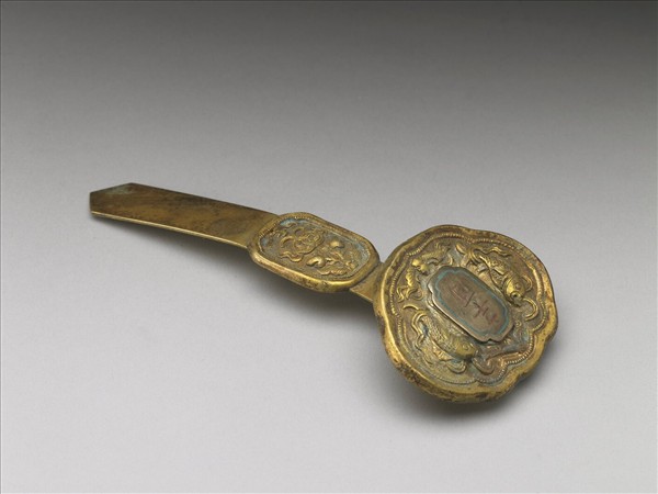 二鑲式如意,雲葉式首,首面中央飾長方形四隅凹填藍色框,中陰刻填紅「辛酉」二字,字上方鐫磬紋,下為蝠,左右兩旁各飾一魚,意寓「福慶有餘」;首下的柄上陰刻楷書「萬年如意」四字;柄中部浮雕蝠、桃、雙錢紋,意寓「福壽在眼前」。院藏一式十二件,首面所刻寫之干支各不相同。(故雜1552-1563)