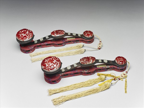 紅木底座三鑲式如意,首部、腹部與趾部各鑲飾白地套紅玻璃。首部圓形嵌片琢刻蝙蝠銜芝,卍字雙桃,與壽山福海三組紋飾,寓意萬壽福祥,綿延永續。柄部嵌片飾以蝙蝠銜磬及雙鯰魚,寓意福至瑞慶,年年有餘。趾部嵌片琢飾蝙蝠銜桃枝,意謂福壽雙全。柄部前後兩段各飾一組雙蝠捧壽。半透明玻璃胎體內懸浮氣泡,如密布大小珠粒,遠觀則白地溟濛如瑞雪紛臨。套紅明潔富麗,與地色對比分明,淺浮雕勻整清晰且具深淺層次變化。原附紅地織錦合牌座上留有「吉和跪進」墨書,可能為杭州將軍吉和於光緒二十年(1894)慈禧太后六十壽辰之際,進獻賀壽之禮。
