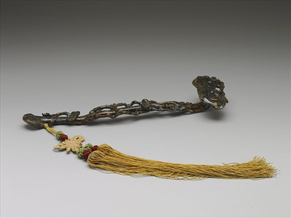 鏤雕灰地黃褐及黑色斑點的布丁瑪瑙為靈芝,小芝緣柄纏繞而上,柄略彎曲,和首黏接,首柄紋飾連貫一致。趾端繫黃雙穗、飾結。