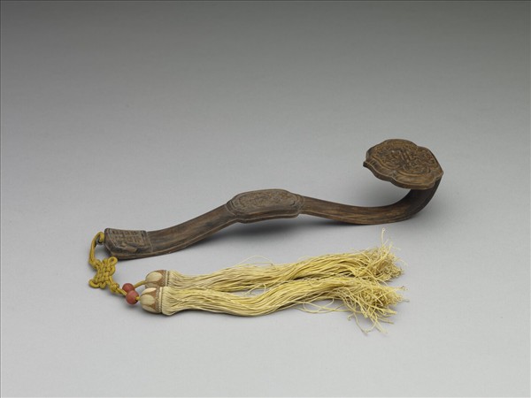 二鑲式如意,如意雲葉式首浮雕五福捧壽紋;柄中央呈長橢圓而四隅凹,浮雕卍字和雙魚;趾成梯形,雕囍一字;首與柄榫接,背光素。趾端繫黃雙穗、飾結。