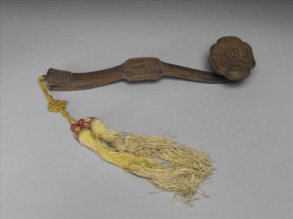 二鑲式如意,如意雲葉式首浮雕五福捧壽紋;柄中央呈長橢圓而四隅凹,浮雕卍字和雙魚;趾成梯形,雕囍一字;首與柄榫接,背光素。趾端繫黃雙穗、飾結。