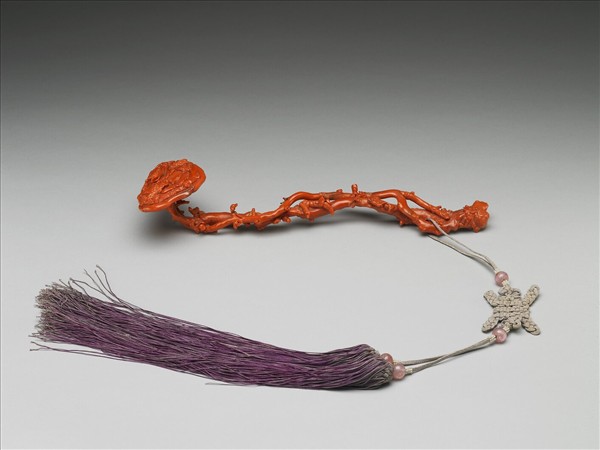 朱紅色珊瑚,通體雕成一靈芝形,粗細二根靈芝莖纏繞成如意柄,柄上遍飾小靈芝;首柄釘黏接合,心形首面浮雕三夔龍出沒在雲端,首背雕祥雲。趾端繫米色壽字結、粉紅碧璽四顆、米珠六組,紫色雙穗。