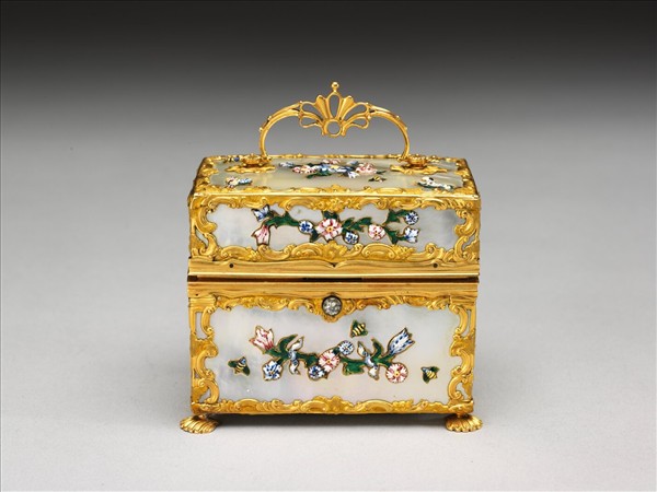 盒裝修容組件,以袖珍便攜形式組裝。此類匣盒內大多配置小鏡、盛裝香水或香料的玻璃瓶,刀、剪、鑷子等。盒之外壁或鑲嵌畫琺瑯片,或嵌螺鈿、瑪瑙、各色寶石,呈現歐洲十八世紀華麗裝飾風格。