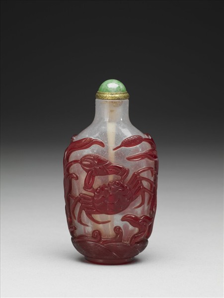 霏雪地扁瓶,瓶套紅色玻璃刻螃蟹雙鉗夾住蘆草,意喻高中科甲,另一面為荷葉、蟾蜍,象徵財富。帶嵌翠玉銅蓋與牙匙。存放於華滋堂燕喜堂中〈清 乾隆 二屜木匣〉百什件中。