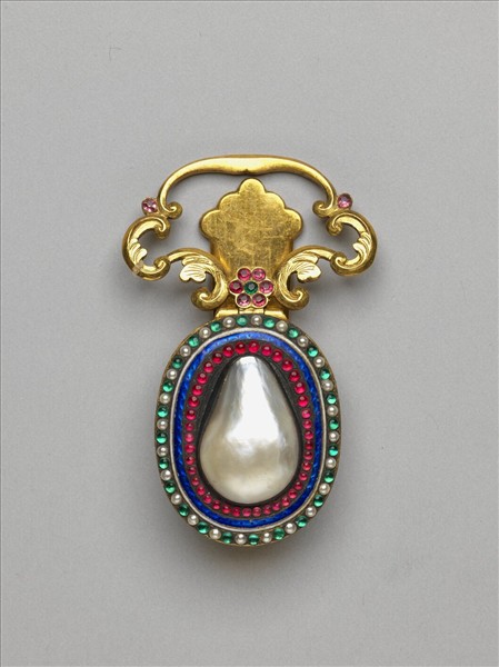 鍍金鑲珠帶板,器身呈橢圓形座,器面鑲一茄形珍珠,周緣綴以紅、綠、藍、白等各色料珠;鍍金座首正面飾卷雲紋,背面則飾如意雲紋。