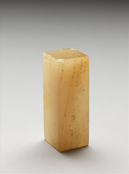 瑪瑙未刻印材,全器呈長方體,印首部位平整,色澤呈半透明黃褐,但不均勻。