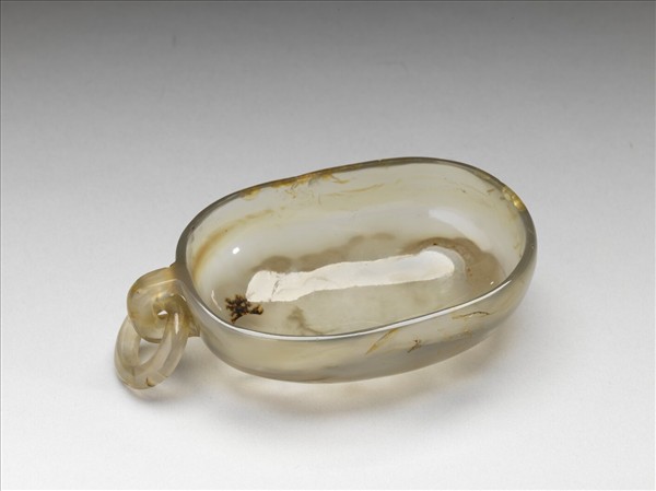 瑪瑙單把活環橢圓洗,淺壁,圓底, 一側接半環狀耳且扣有圓形活環,造形精巧優雅。全器色澤呈黃褐色半透明,並且帶有天然深褐色斑。