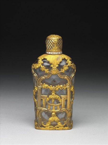 長形切割玻璃扁瓶,外鑲刻渦捲式花葉紋金框,有玻璃蓋,外有雕金花旋紐蓋。瓶蓋口緣白色琺瑯金字法文「VOTRE AMITIÉ ENRETOUR」。這類多曲線且華麗的鑲金框玻璃小瓶,多為英皇喬治三世時製品。