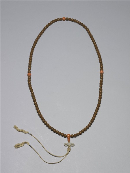 菩提念珠一串計一百零八粒,每隔二十七粒間一珊瑚佛頭,共四粒,其一帶佛頭塔及白玉金剛杵,下繫黃縧帶。
