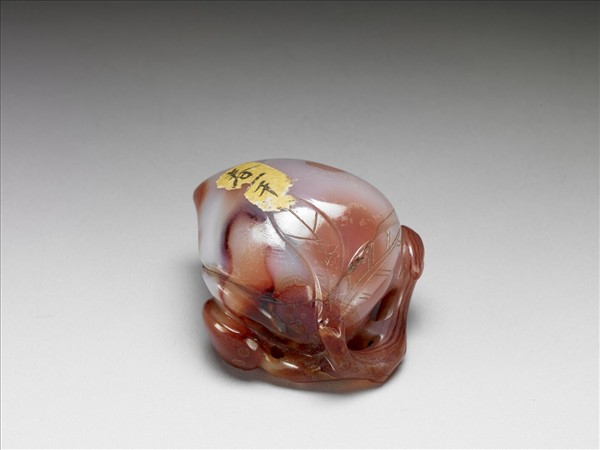 瑪瑙桃,全器紅色與白色交錯,雕為一連枝帶葉的桃實。桃實碩大,其上紅白彩色交雜而繽紛,浮雕如貼附於桃實表面的葉片,更是襯映桃實飽滿的弧度。枝幹主要盤據於桃實下方,而此處之瑪瑙的紅色也較密集,色調較沉,位於下方,產生有如器座之穩定整體的作用。