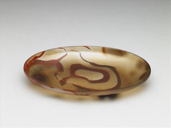 瑪瑙碟,廣口,弧壁下收。器壁略透,淺玳瑁色中有朱紅色斑,朱紅色斑流轉如波,猶如在器壁上流動著幾條朱紅色色帶,為簡單的器形增添生意。