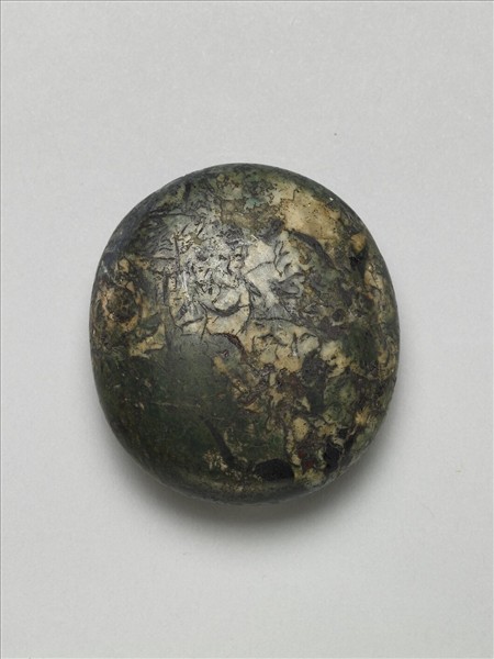 圓扁石,綠色間雜白斑,白色部分有淺凹痕,似為刻飾圖案的陰線,但難以辨別。