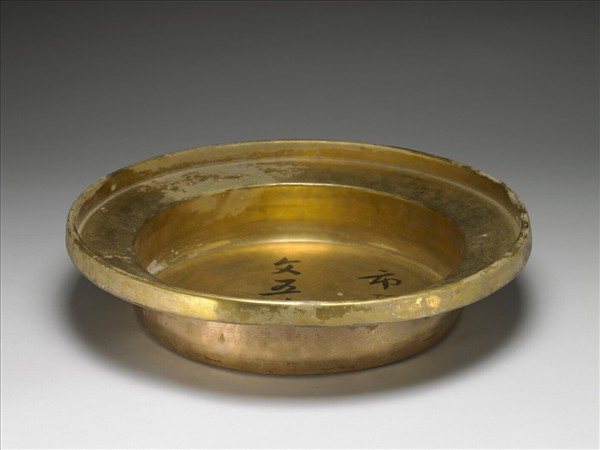 盤口,豎邊,淺壁,平底。銅胎鍍金,光素無紋。